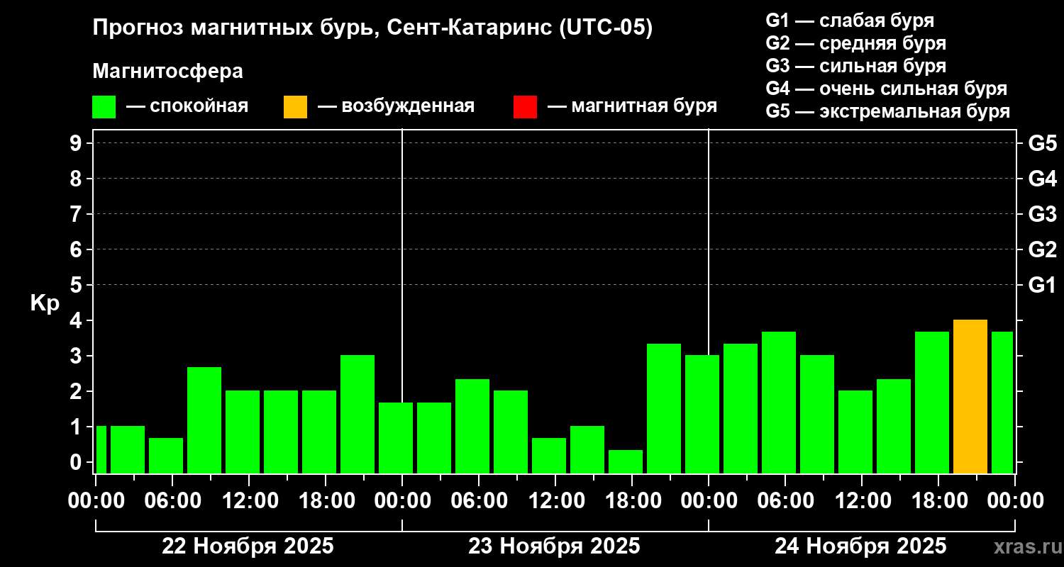 Прогноз магнитных бурь в Сент-Катаринсе — 22 ноября 2025 года