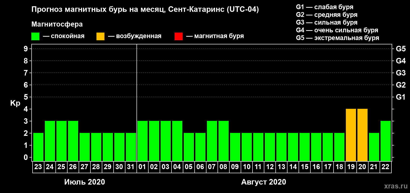 Прогноз магнитных бурь в Сент-Катаринсе — 23 июля 2020 года