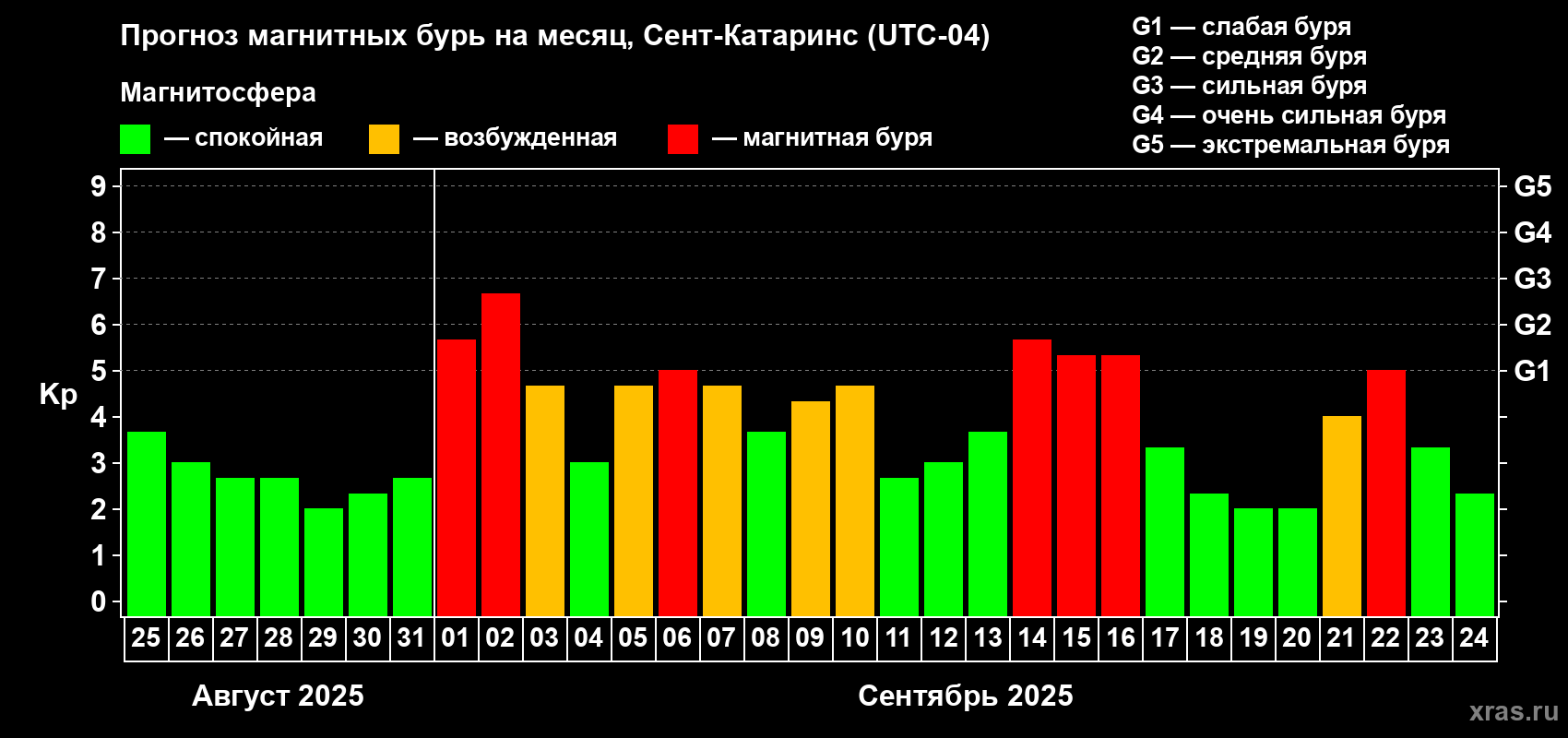Прогноз магнитных бурь в Сент-Катаринсе — 25 августа 2025 года