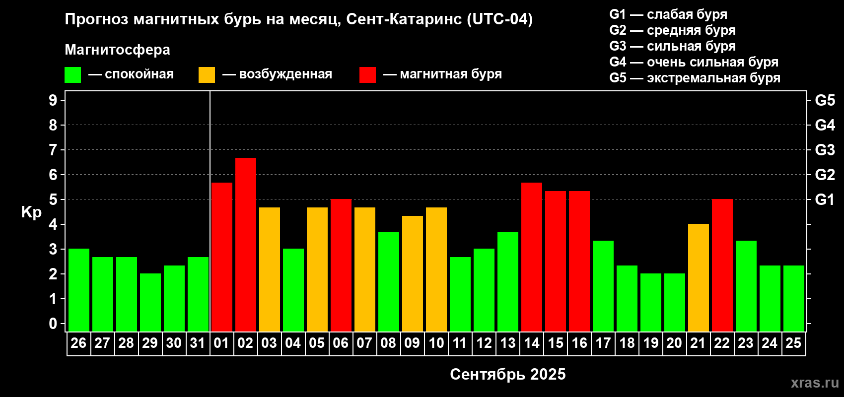 Прогноз магнитных бурь в Сент-Катаринсе — 26 августа 2025 года