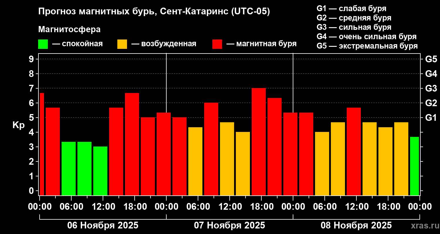 Прогноз магнитных бурь в Сент-Катаринсе — 6 ноября 2025 года