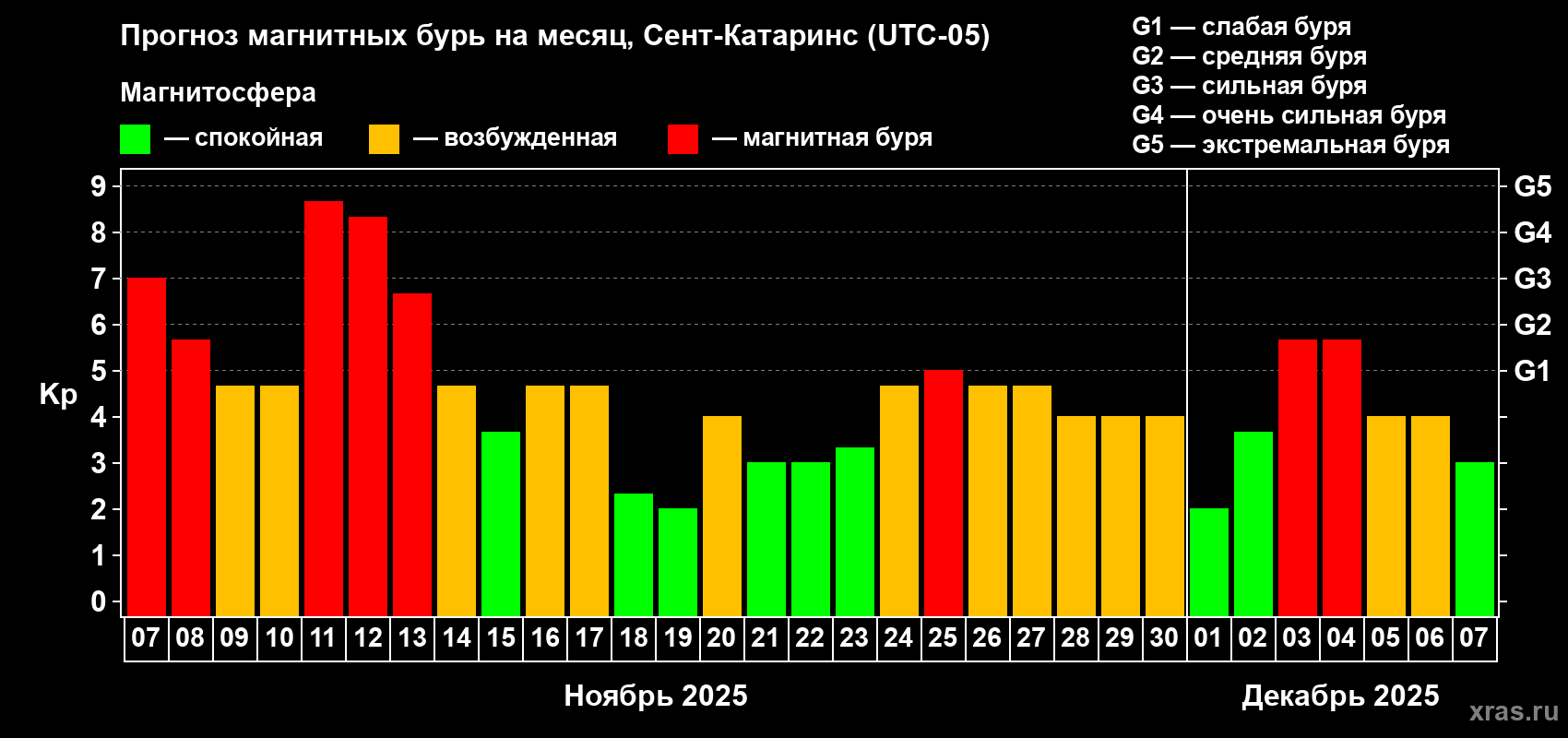 Прогноз магнитных бурь в Сент-Катаринсе — 7 ноября 2025 года
