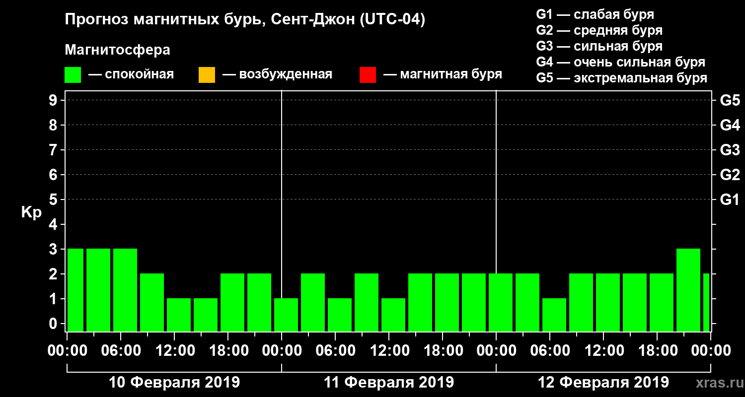 Прогноз магнитных бурь в Сент-Джоне на 10 февраля 2019 года