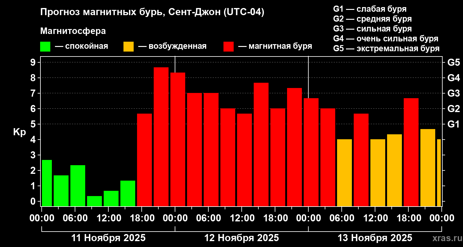 Прогноз магнитных бурь в Сент-Джоне на 11 ноября 2025 года