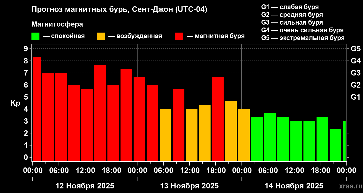 Прогноз магнитных бурь в Сент-Джоне на 12 ноября 2025 года