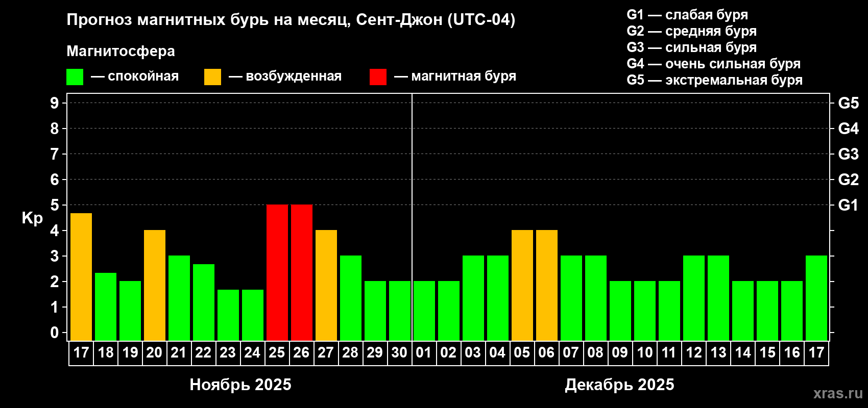 Прогноз магнитных бурь в Сент-Джоне на 17 ноября 2025 года