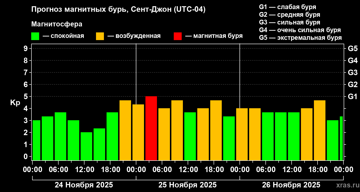 Прогноз магнитных бурь в Сент-Джоне на 24 ноября 2025 года