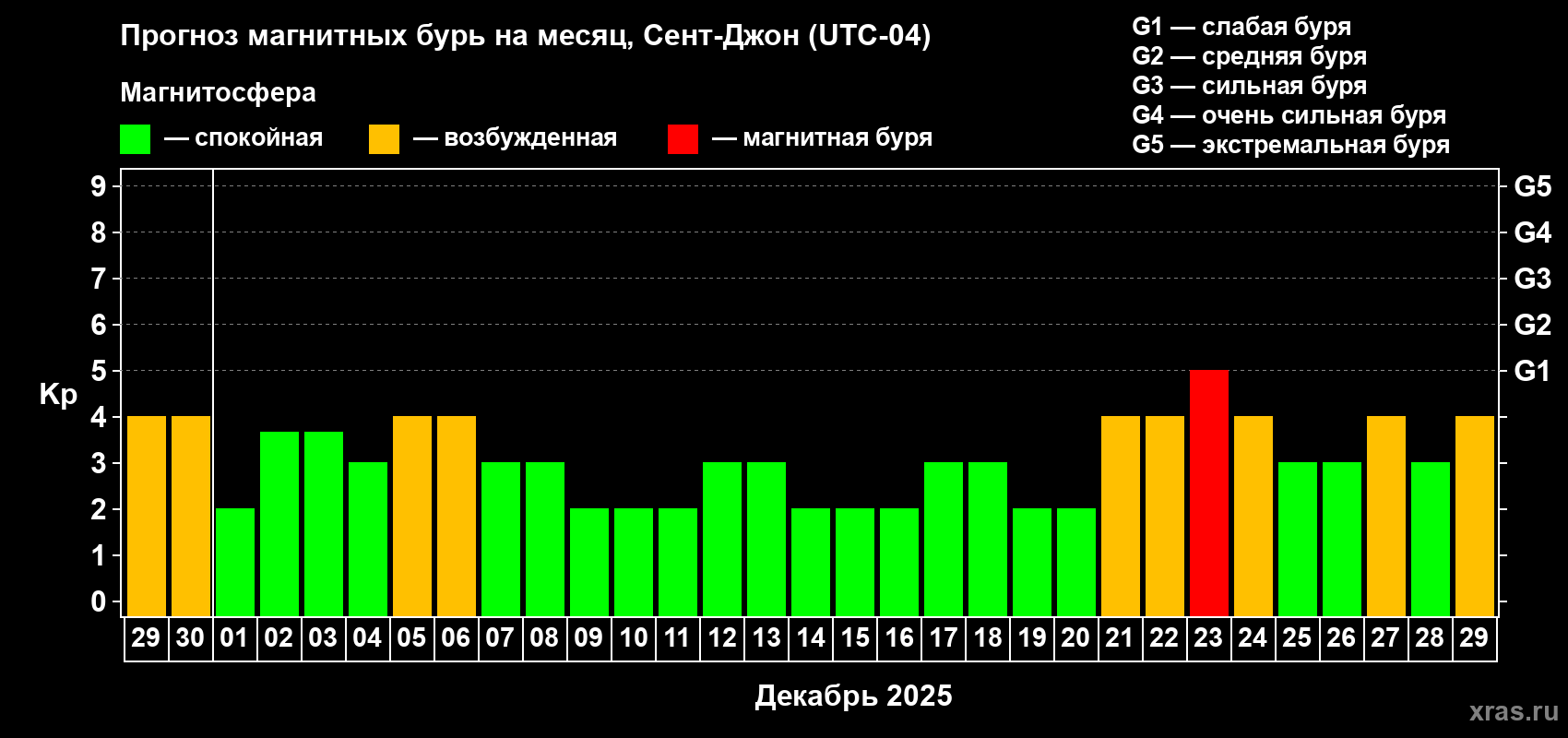 Прогноз магнитных бурь в Сент-Джоне на 29 ноября 2025 года