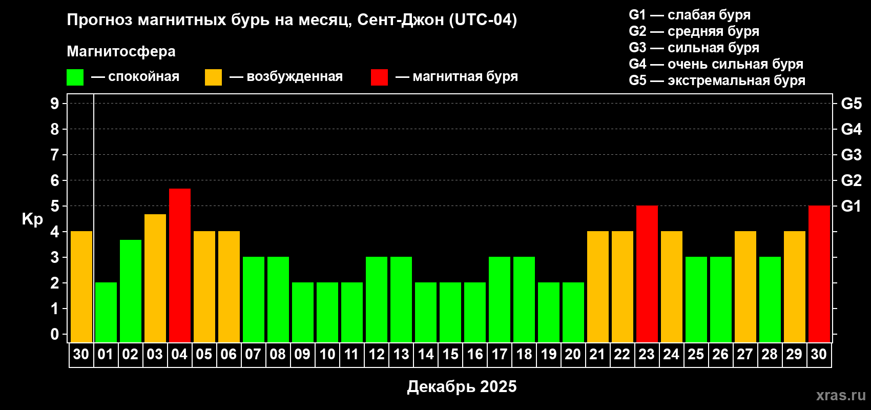 Прогноз магнитных бурь в Сент-Джоне на 30 ноября 2025 года
