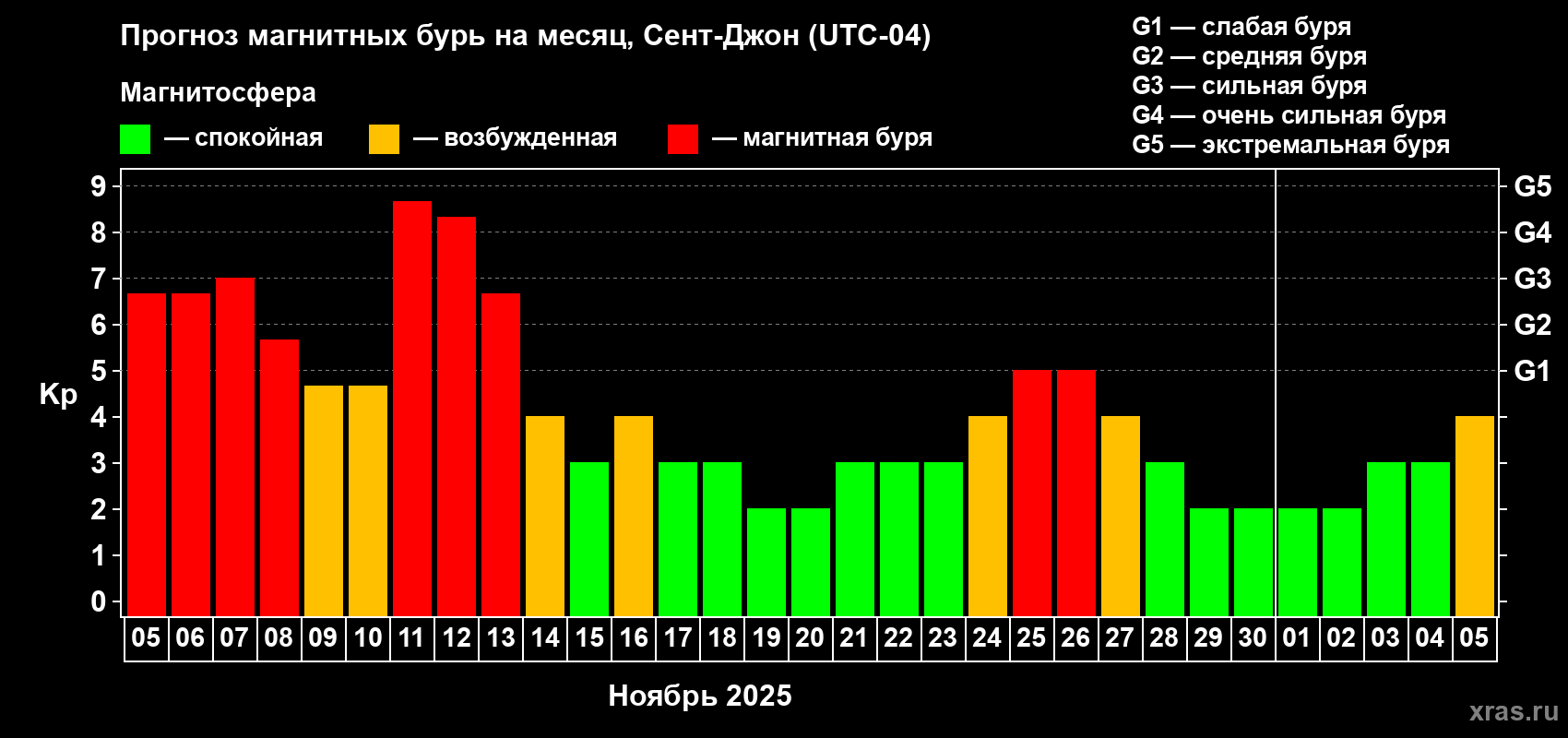 Прогноз магнитных бурь в Сент-Джоне на 5 ноября 2025 года