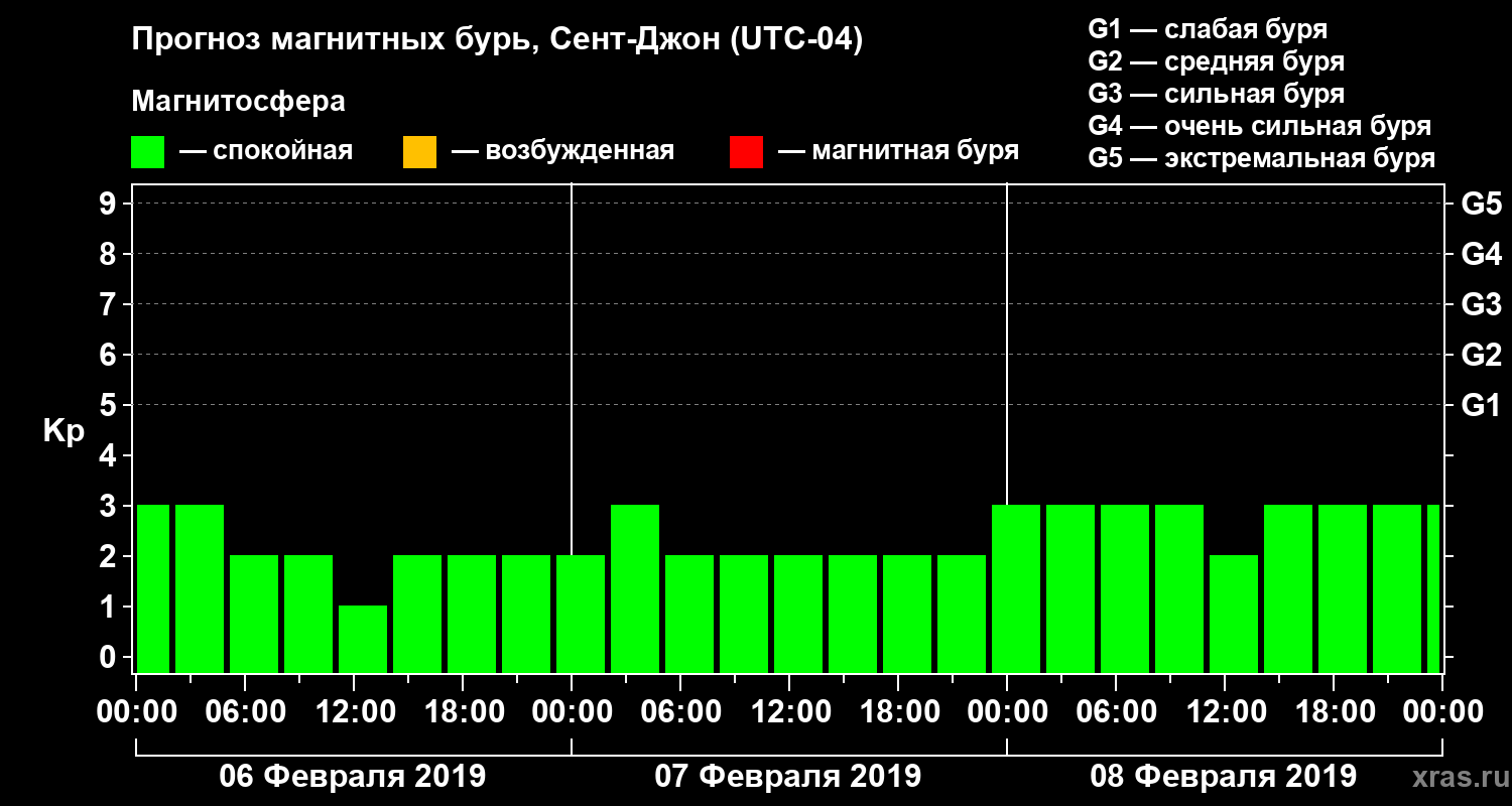 Прогноз магнитных бурь в Сент-Джоне на 6 февраля 2019 года