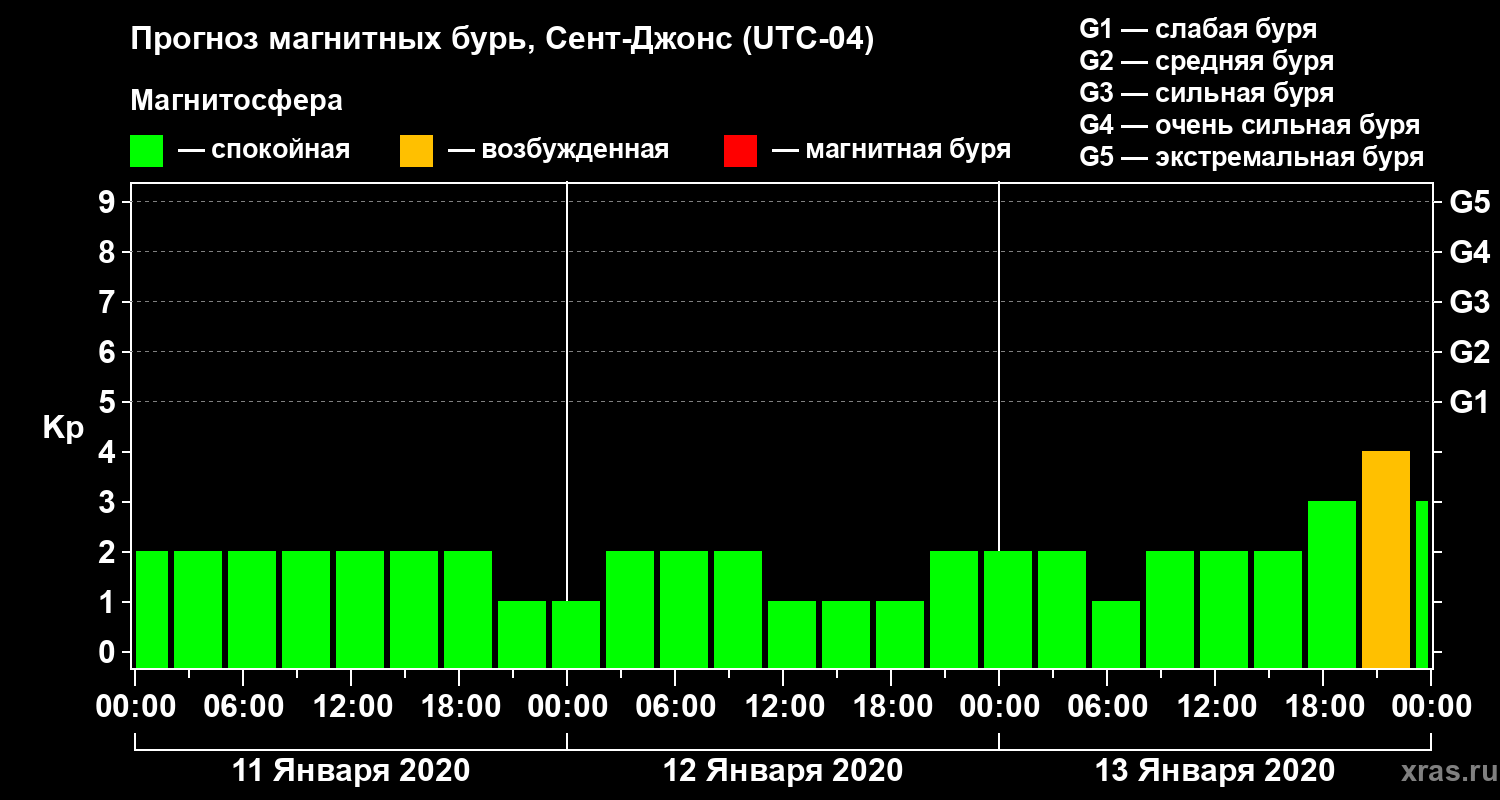 Прогноз магнитных бурь в Сент-Джонсе на 11 января 2020 года