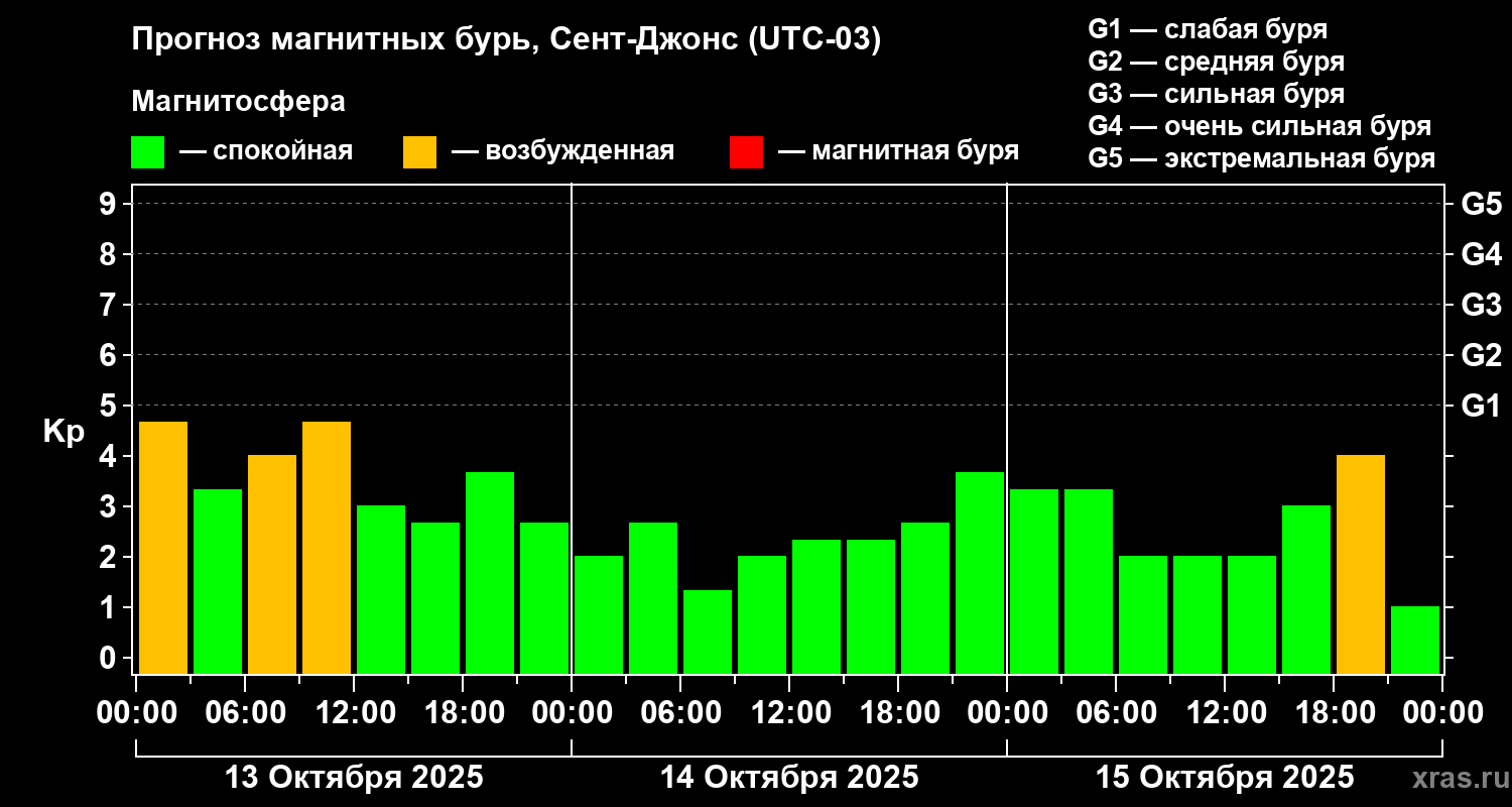 Прогноз магнитных бурь в Сент-Джонсе на 13 октября 2025 года