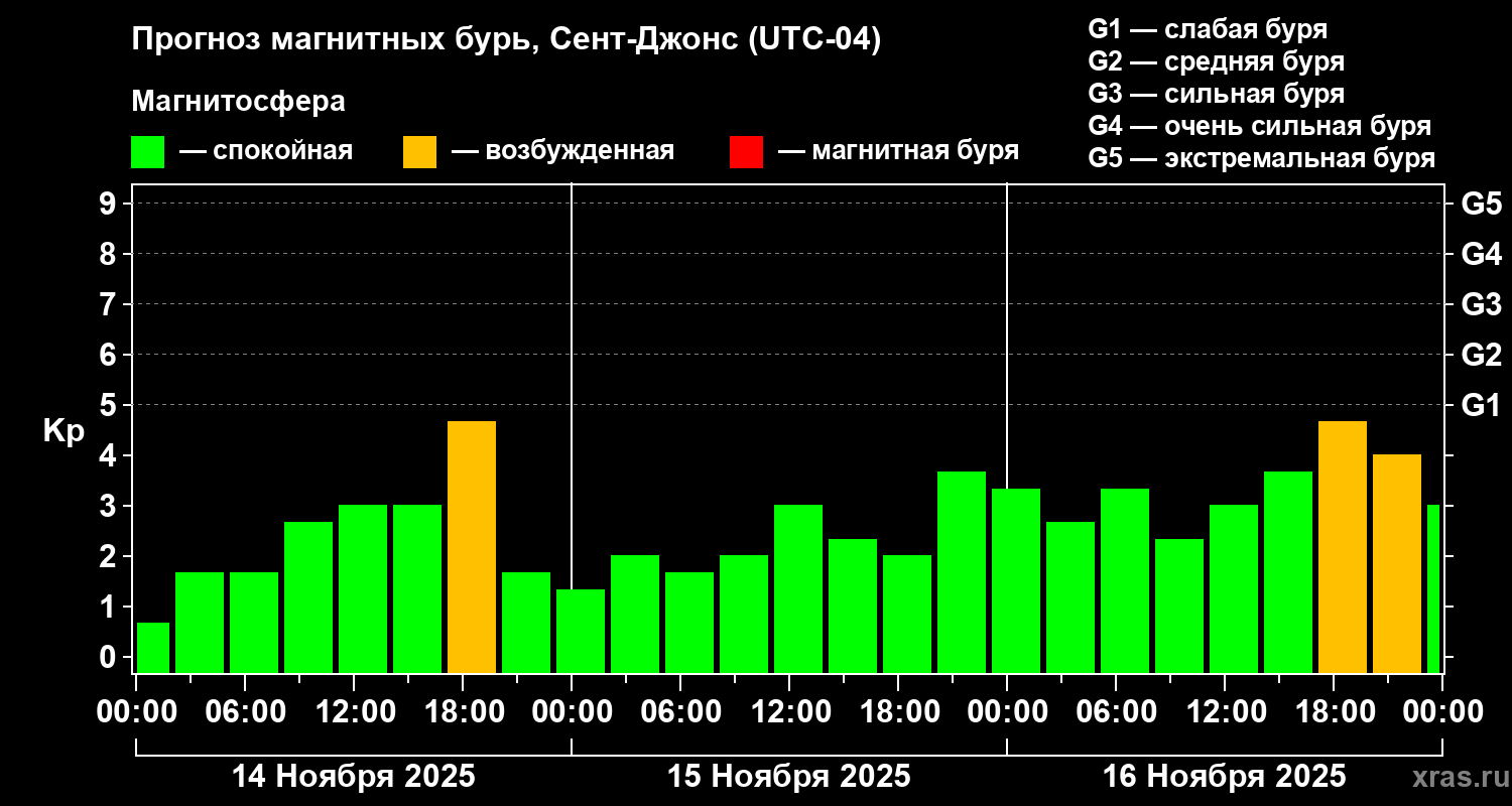 Прогноз магнитных бурь в Сент-Джонсе на 14 ноября 2025 года