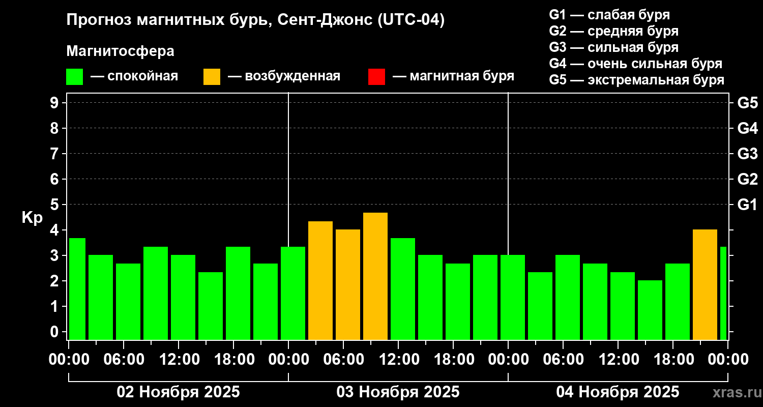 Прогноз магнитных бурь в Сент-Джонсе — 2 ноября 2025 года