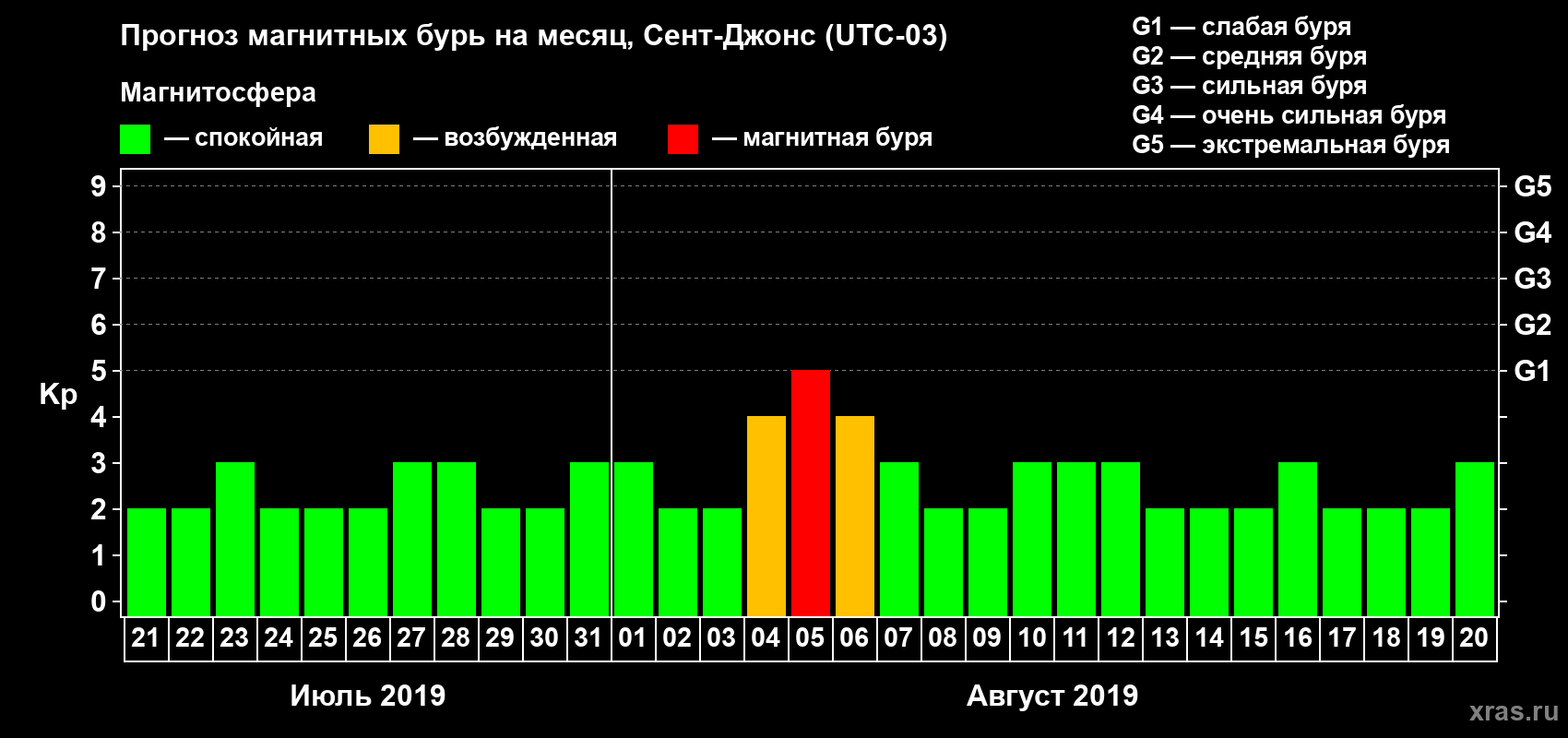 Прогноз магнитных бурь в Сент-Джонсе — 21 июля 2019 года