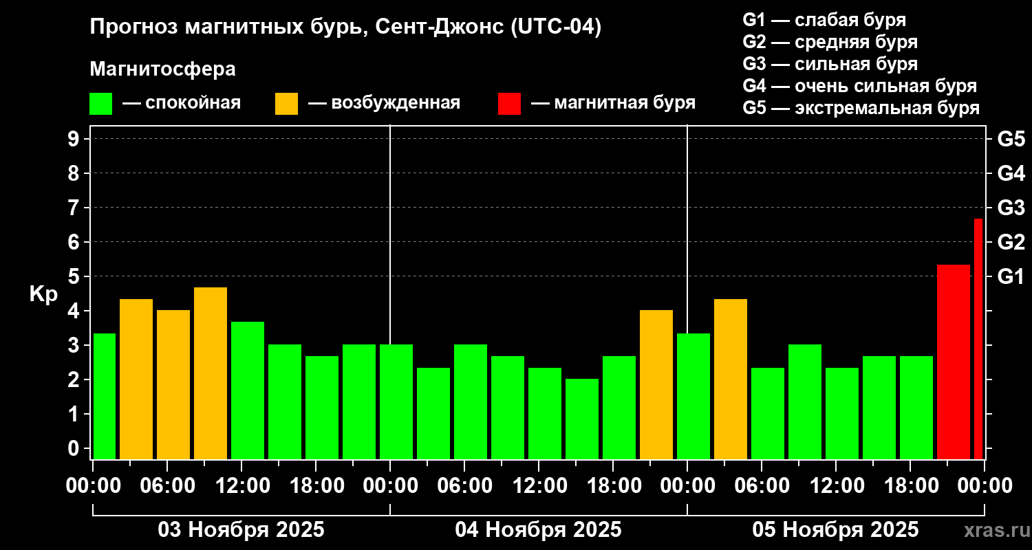 Прогноз магнитных бурь в Сент-Джонсе на 3 ноября 2025 года
