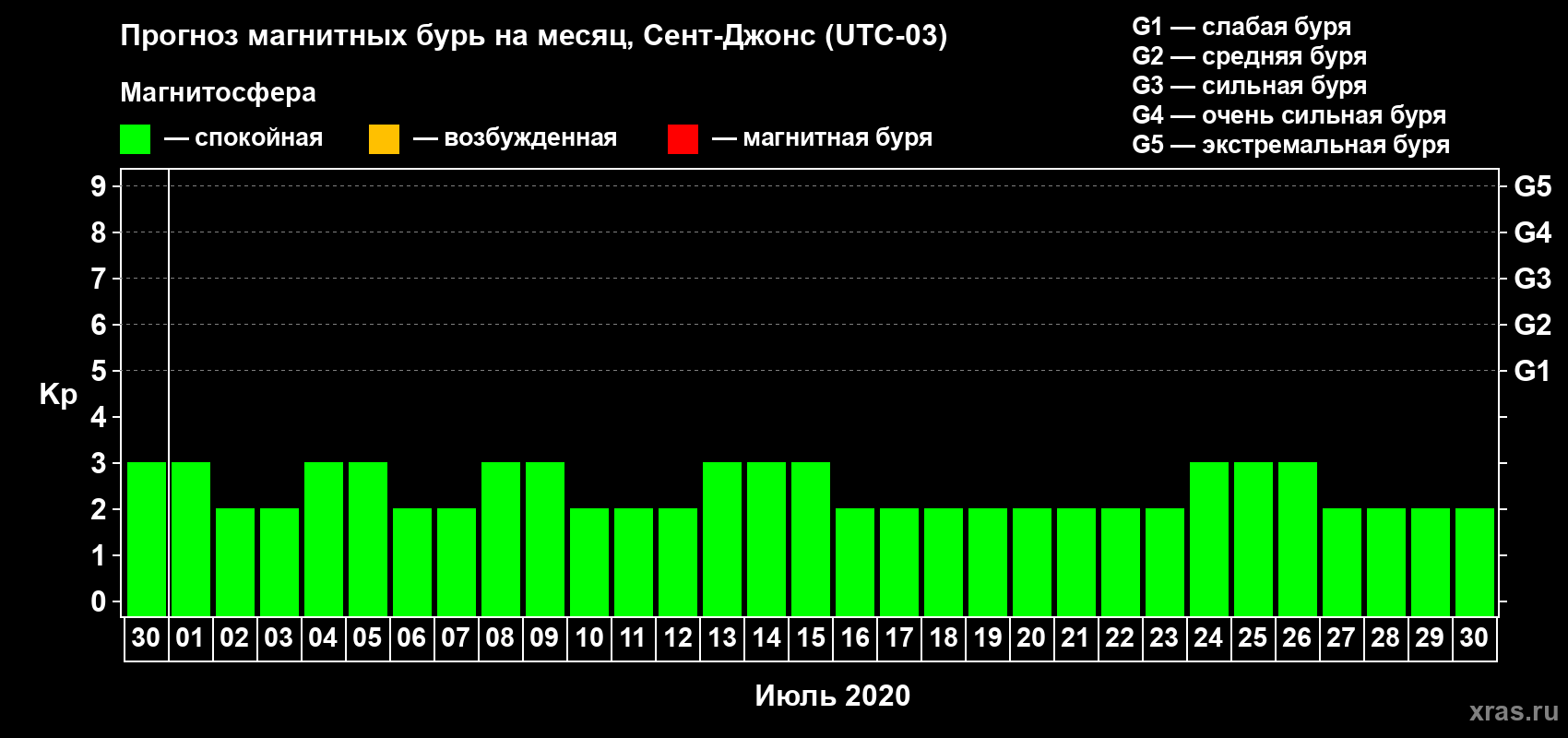 Прогноз магнитных бурь в Сент-Джонсе — 30 июня 2020 года