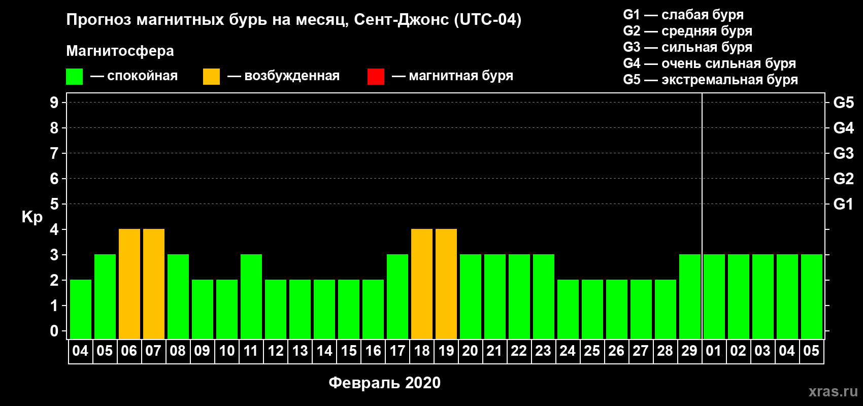 Прогноз магнитных бурь в Сент-Джонсе на 4 февраля 2020 года