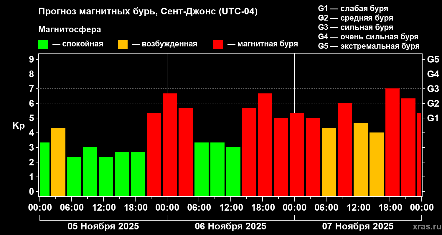 Прогноз магнитных бурь в Сент-Джонсе на 5 ноября 2025 года