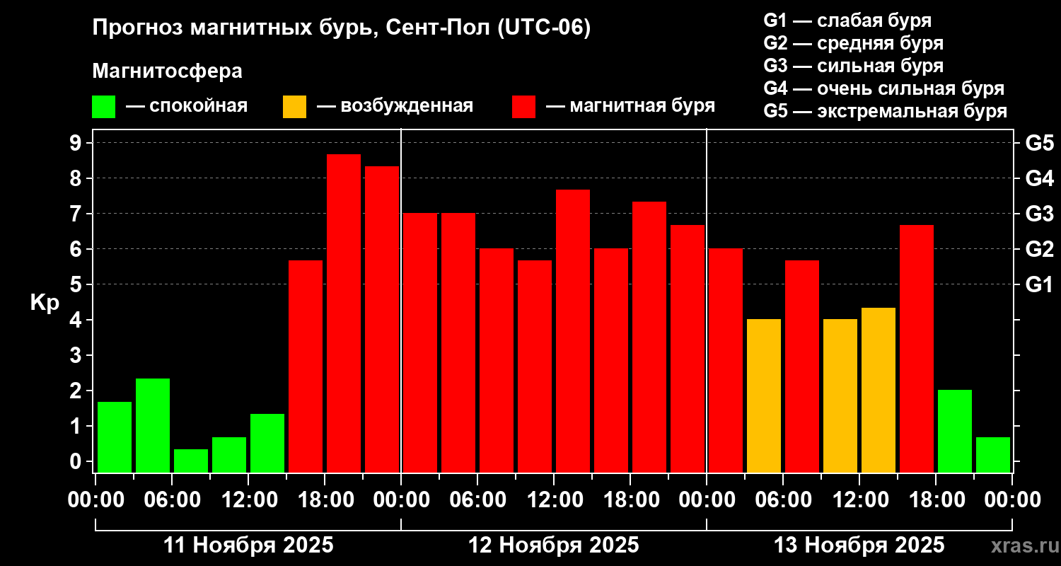 Прогноз магнитных бурь в Сент-Поле — 11 ноября 2025 года