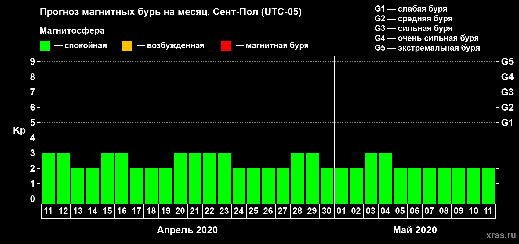 Прогноз магнитных бурь в Сент-Поле на 11 апреля 2020 года