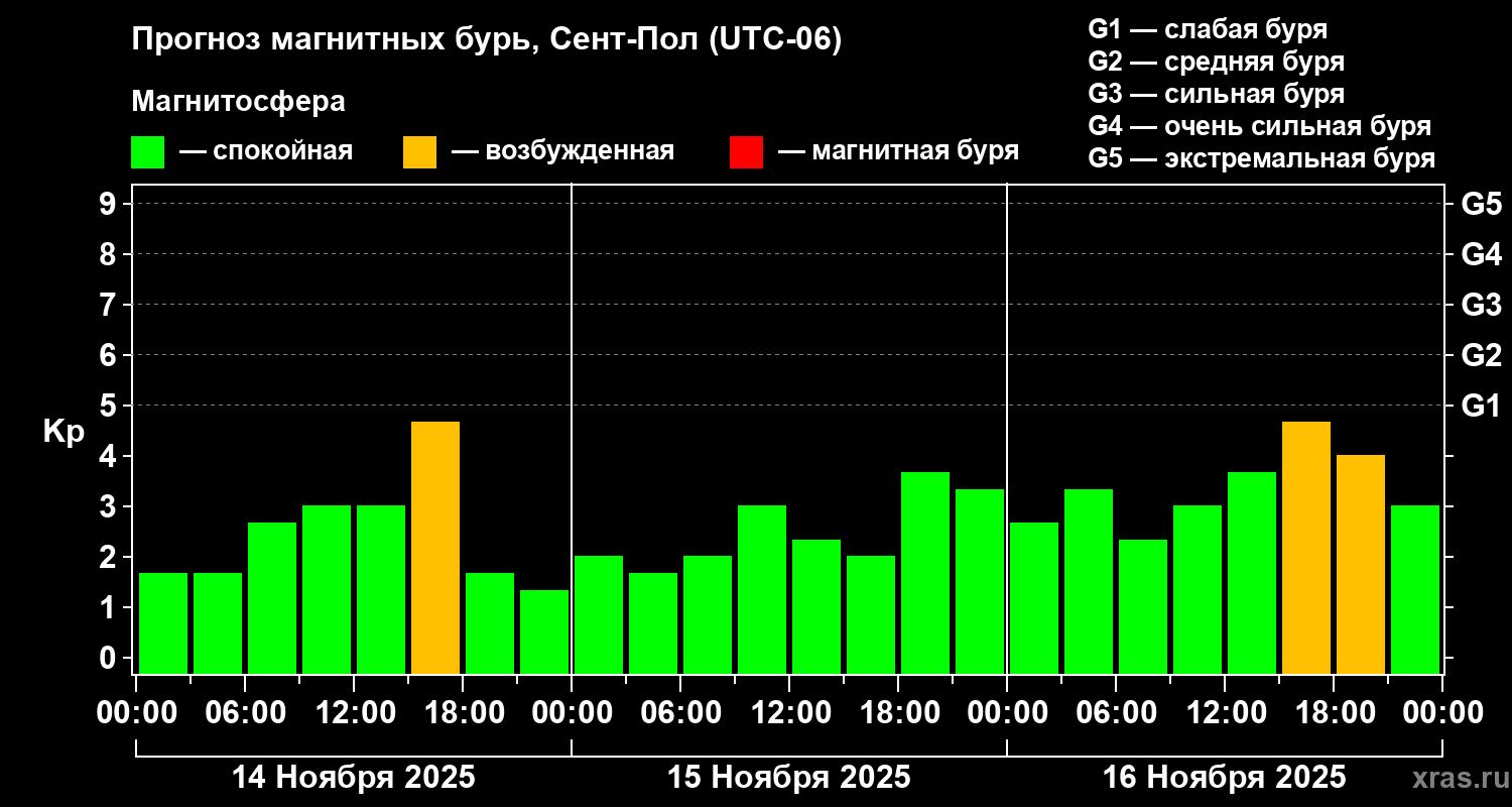 Прогноз магнитных бурь в Сент-Поле — 14 ноября 2025 года