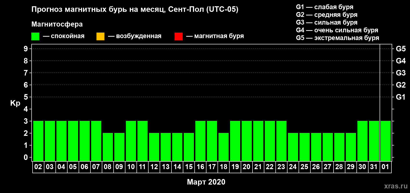 Прогноз магнитных бурь в Сент-Поле на 2 марта 2020 года