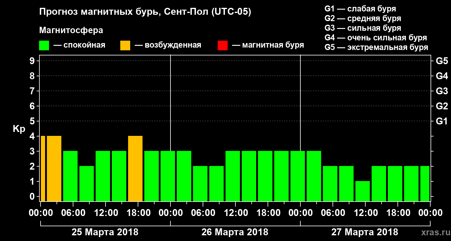 Прогноз магнитных бурь в Сент-Поле на 25 марта 2018 года