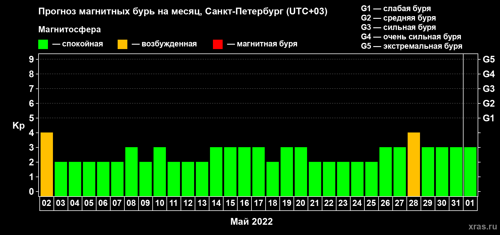 Прогноз магнитных бурь в Санкт-Петербурге — 2 мая 2022 года