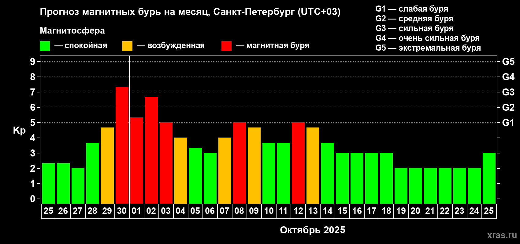Прогноз магнитных бурь в Санкт-Петербурге — 25 сентября 2025 года