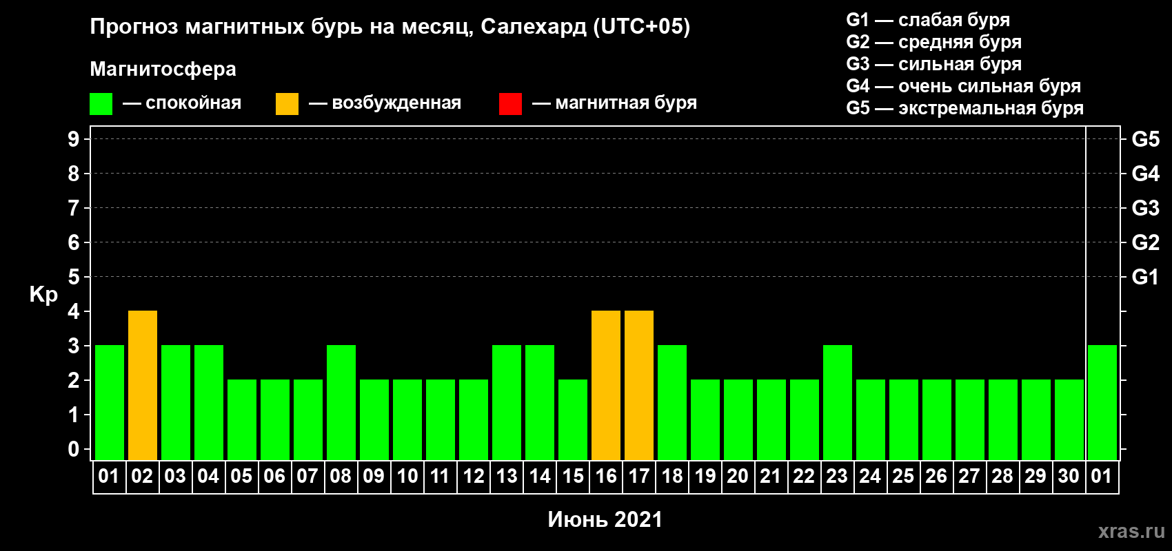 Прогноз магнитных бурь в Салехарде на 1 июня 2021 года