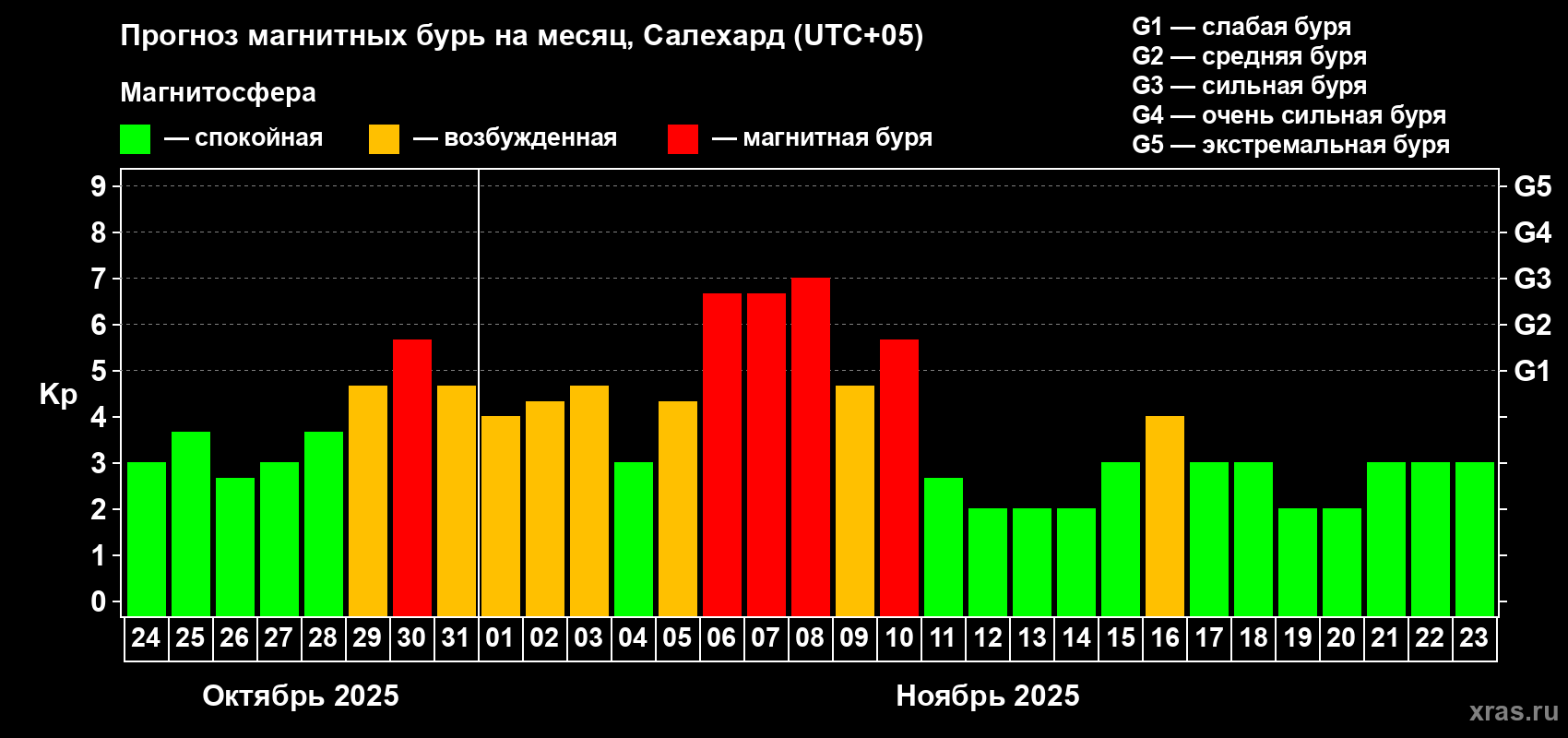 Прогноз магнитных бурь в Салехарде — 24 октября 2025 года