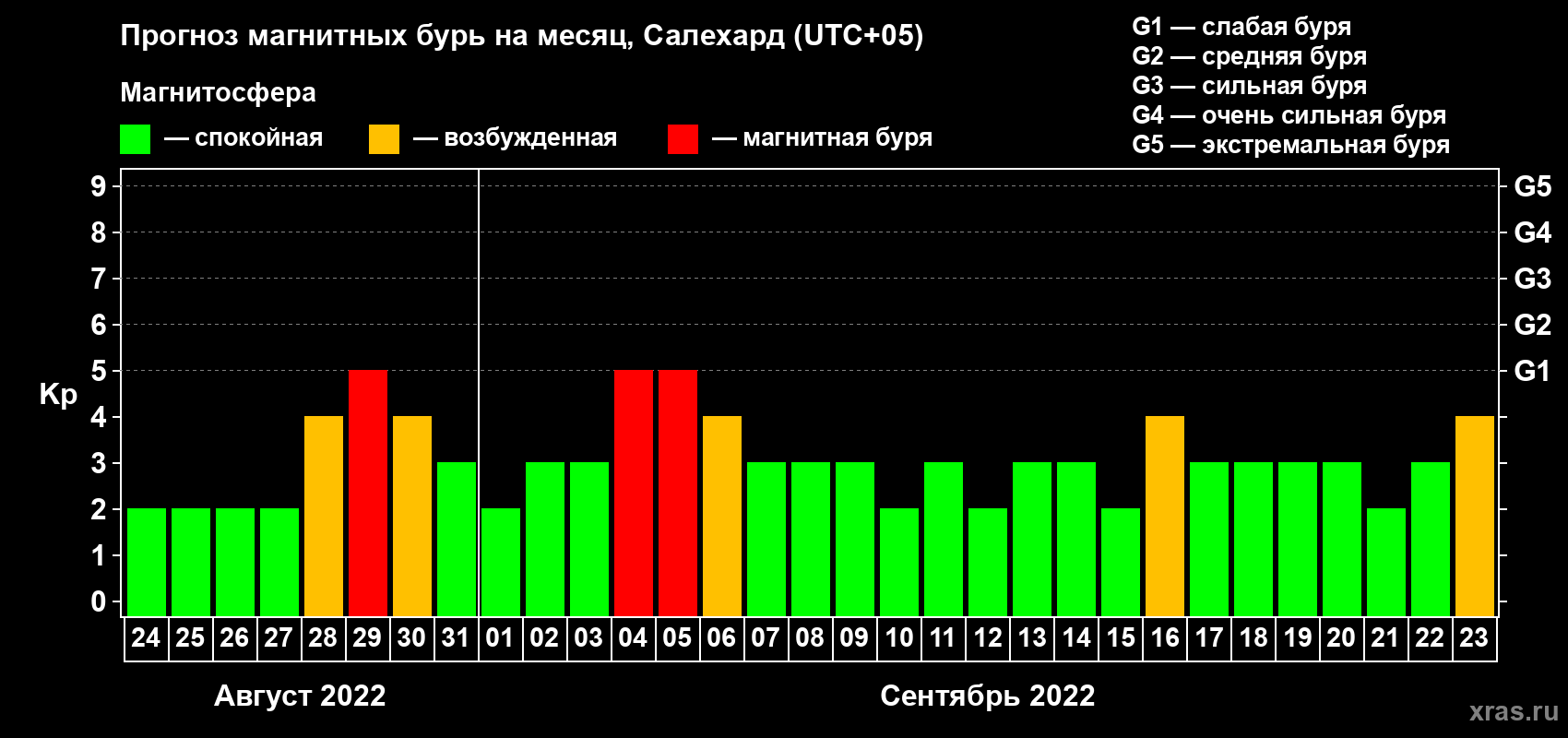 Прогноз магнитных бурь в Салехарде на 24 августа 2022 года