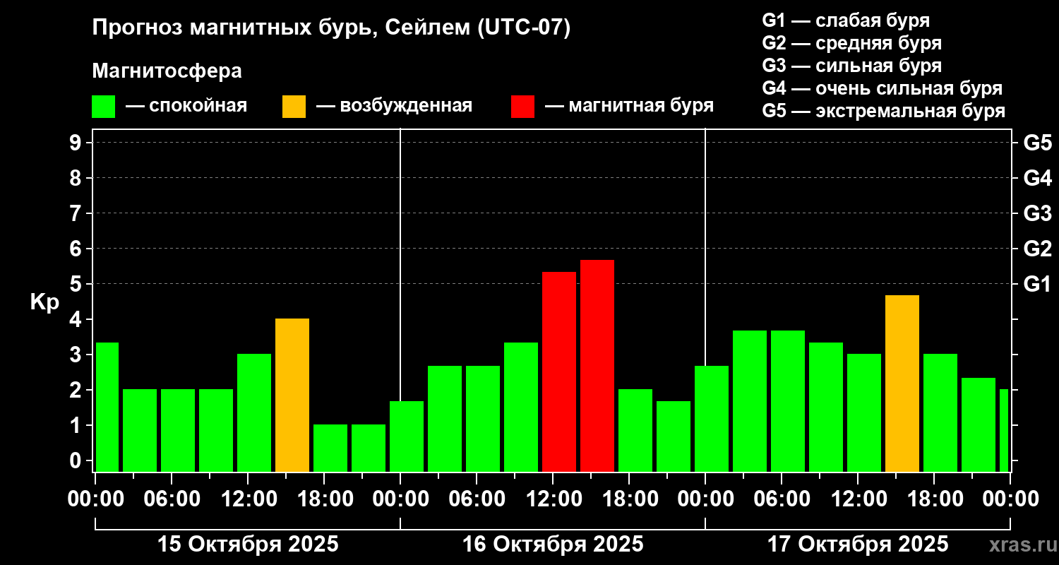Прогноз магнитных бурь в Сейлеме на 15 октября 2025 года