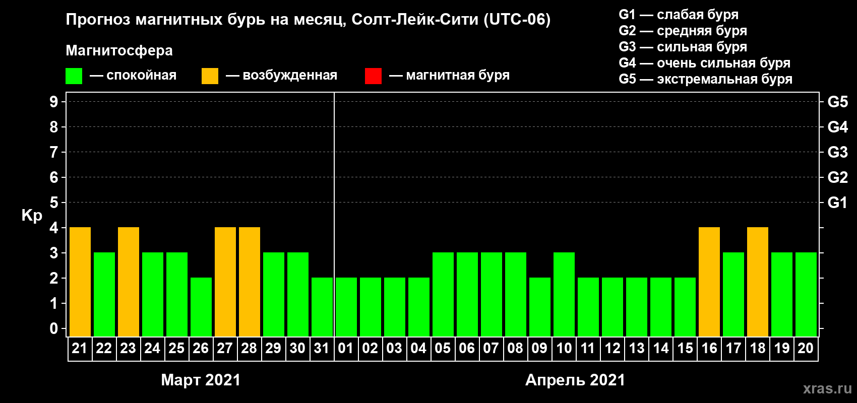 Прогноз магнитных бурь Солт-Лейк-Сити на 21 марта 2021 года