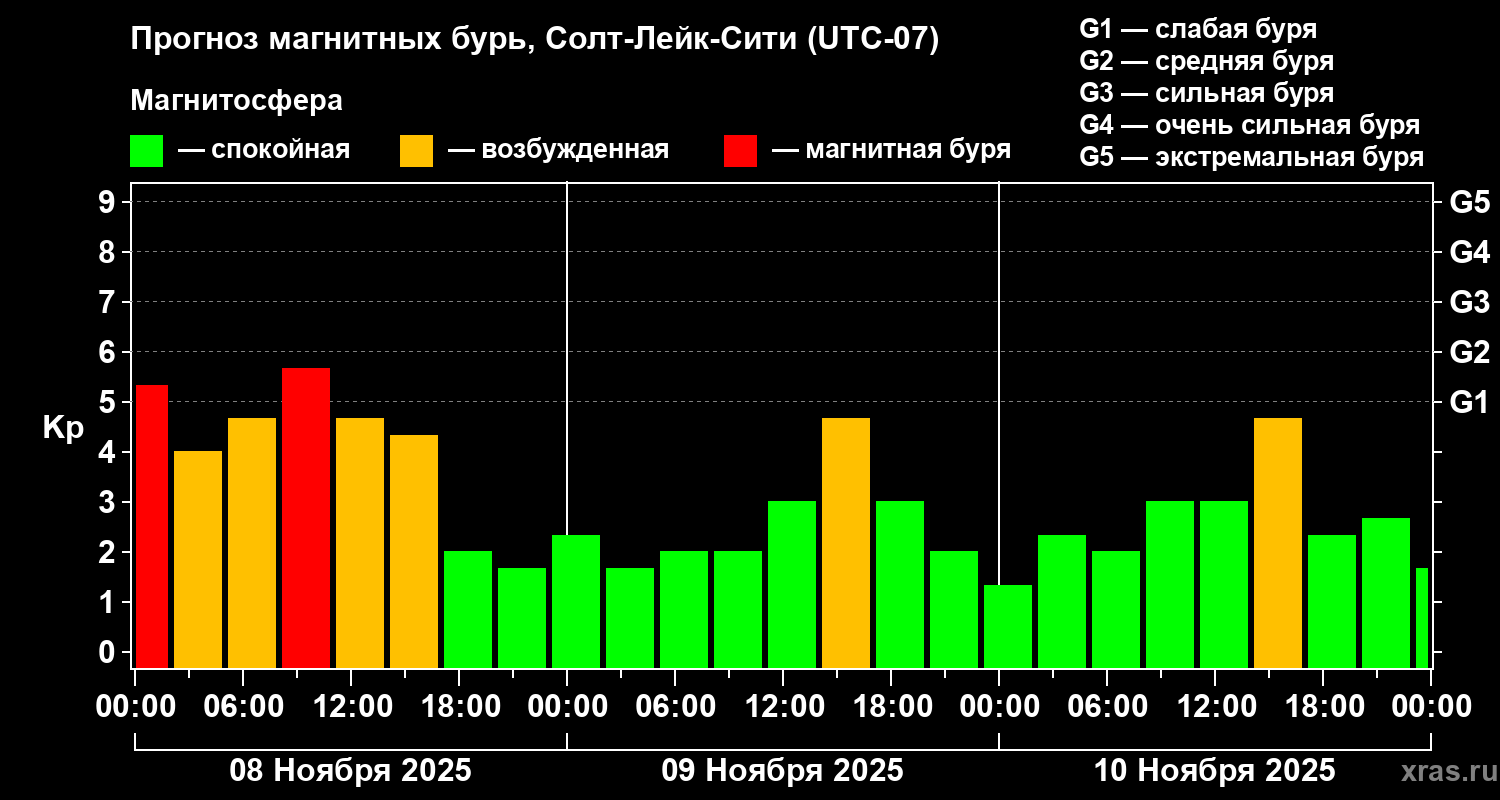 Прогноз магнитных бурь Солт-Лейк-Сити на 8 ноября 2025 года