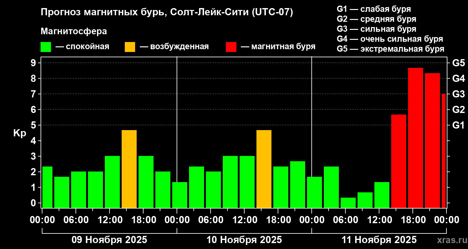Прогноз магнитных бурь Солт-Лейк-Сити на 9 ноября 2025 года