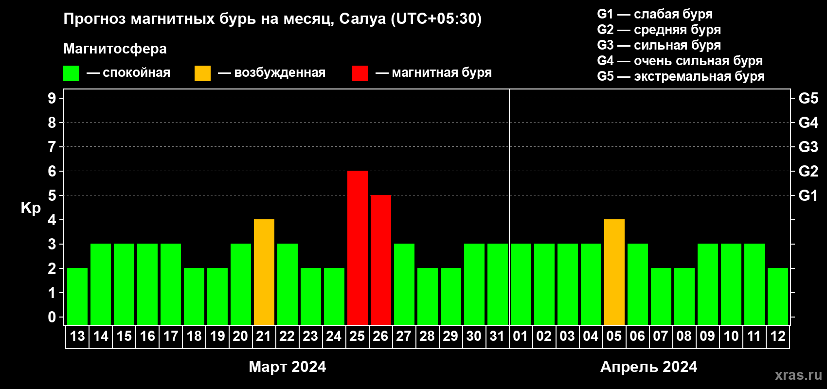 Прогноз магнитных бурь в Салуе — 13 марта 2024 года