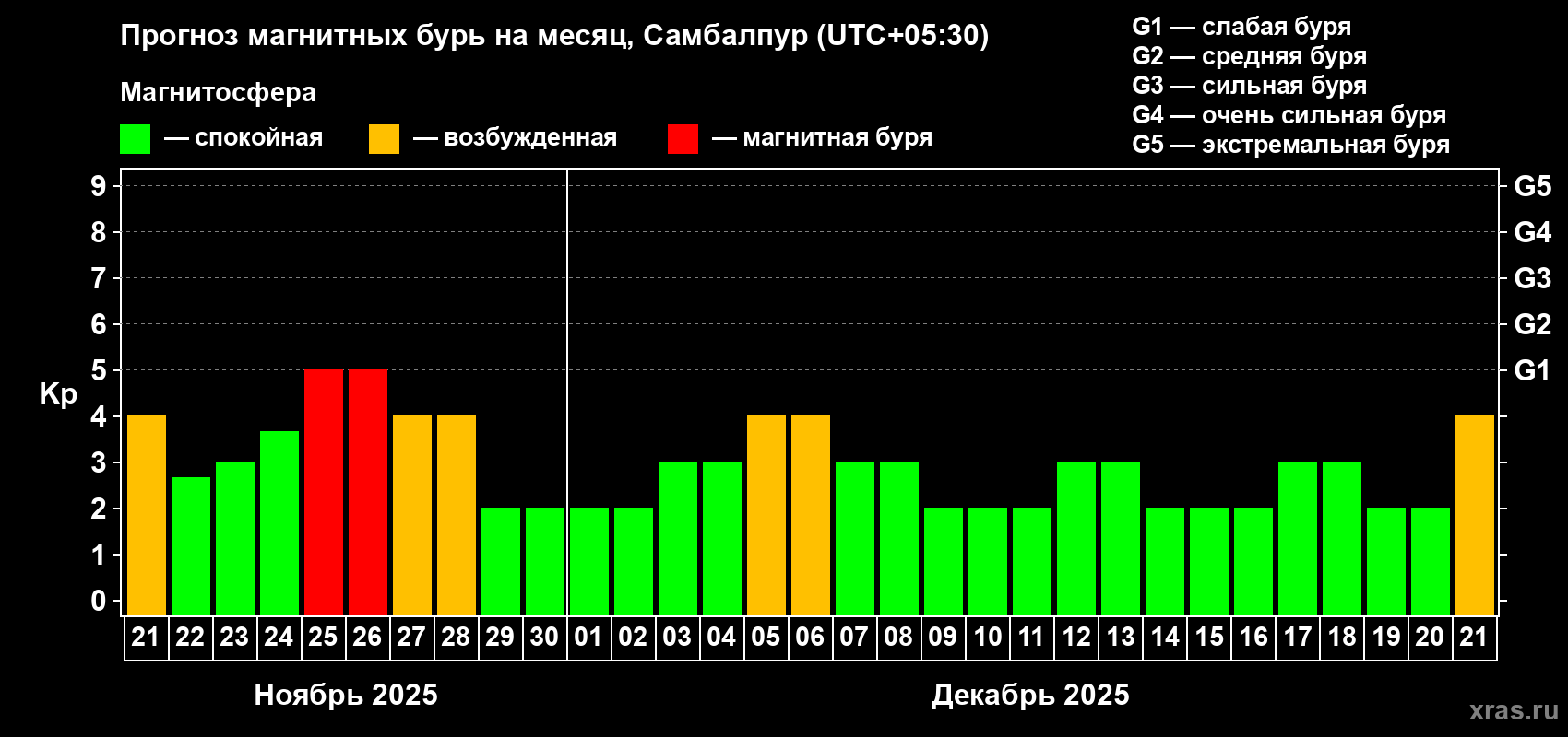 Прогноз магнитных бурь в Самбалпуре — 21 ноября 2025 года