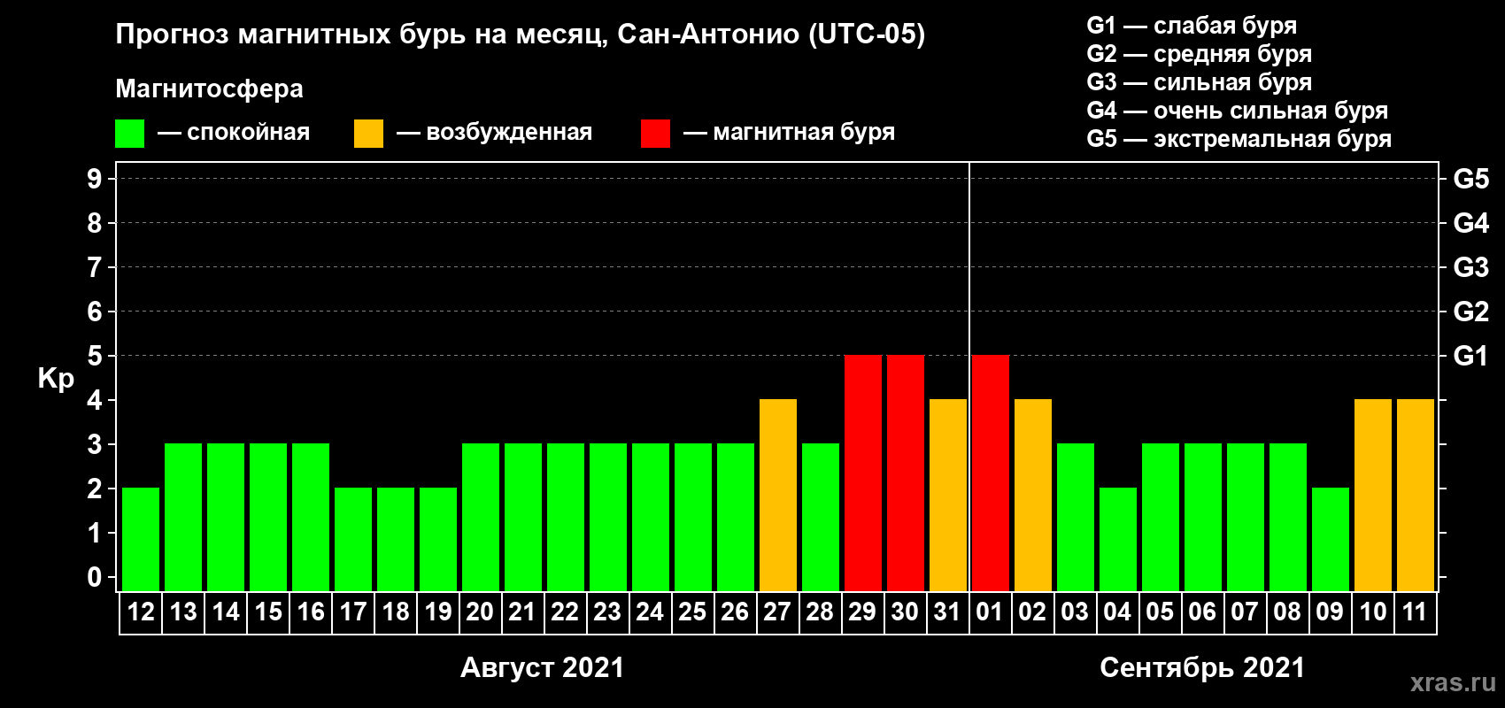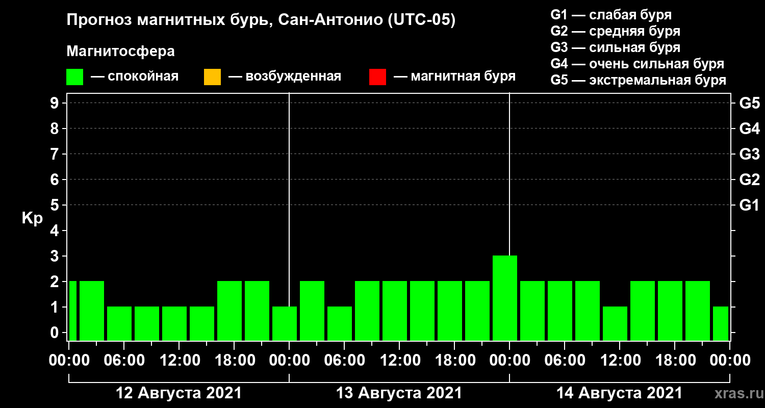 Прогноз магнитных бурь Сан-Антонио на 12 августа 2021 года