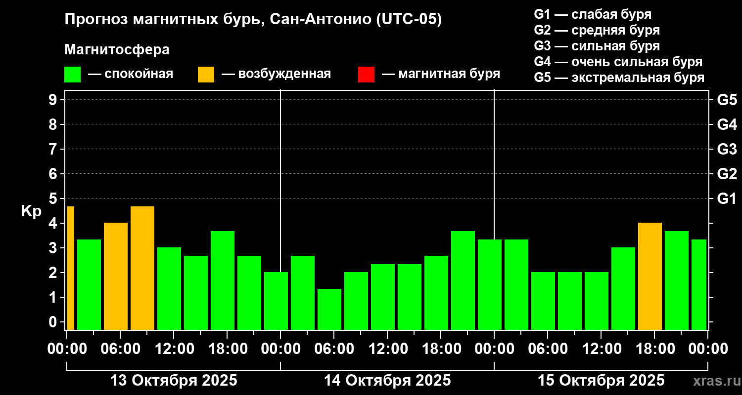 Прогноз магнитных бурь Сан-Антонио на 13 октября 2025 года