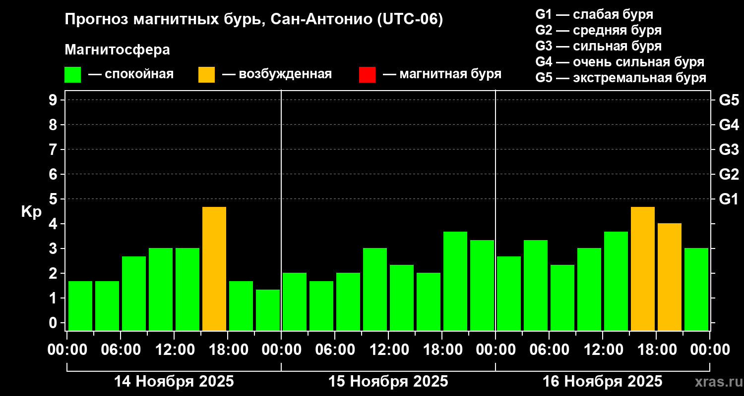 Прогноз магнитных бурь Сан-Антонио на 14 ноября 2025 года