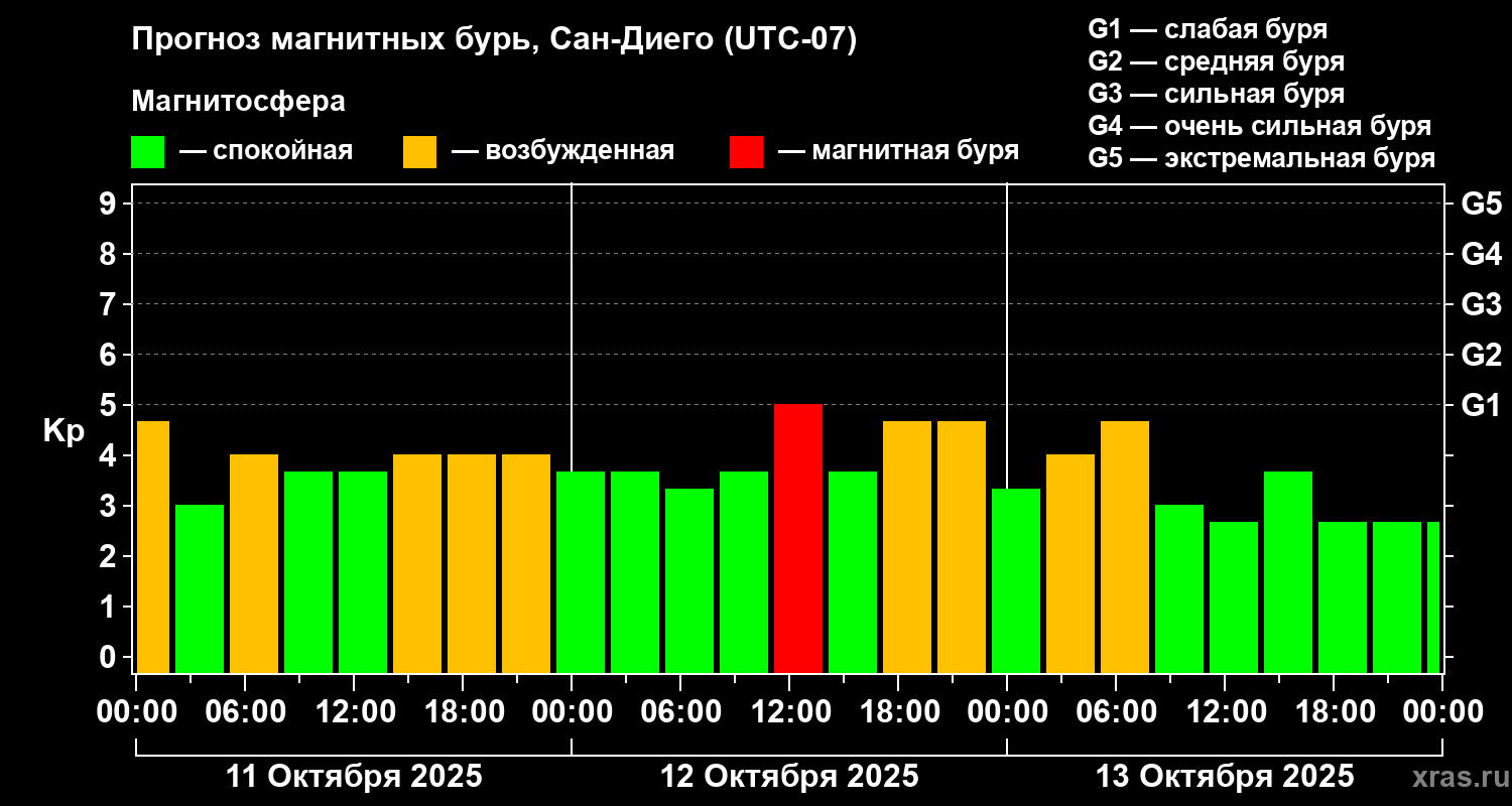 Прогноз магнитных бурь Сан-Диего на 11 октября 2025 года
