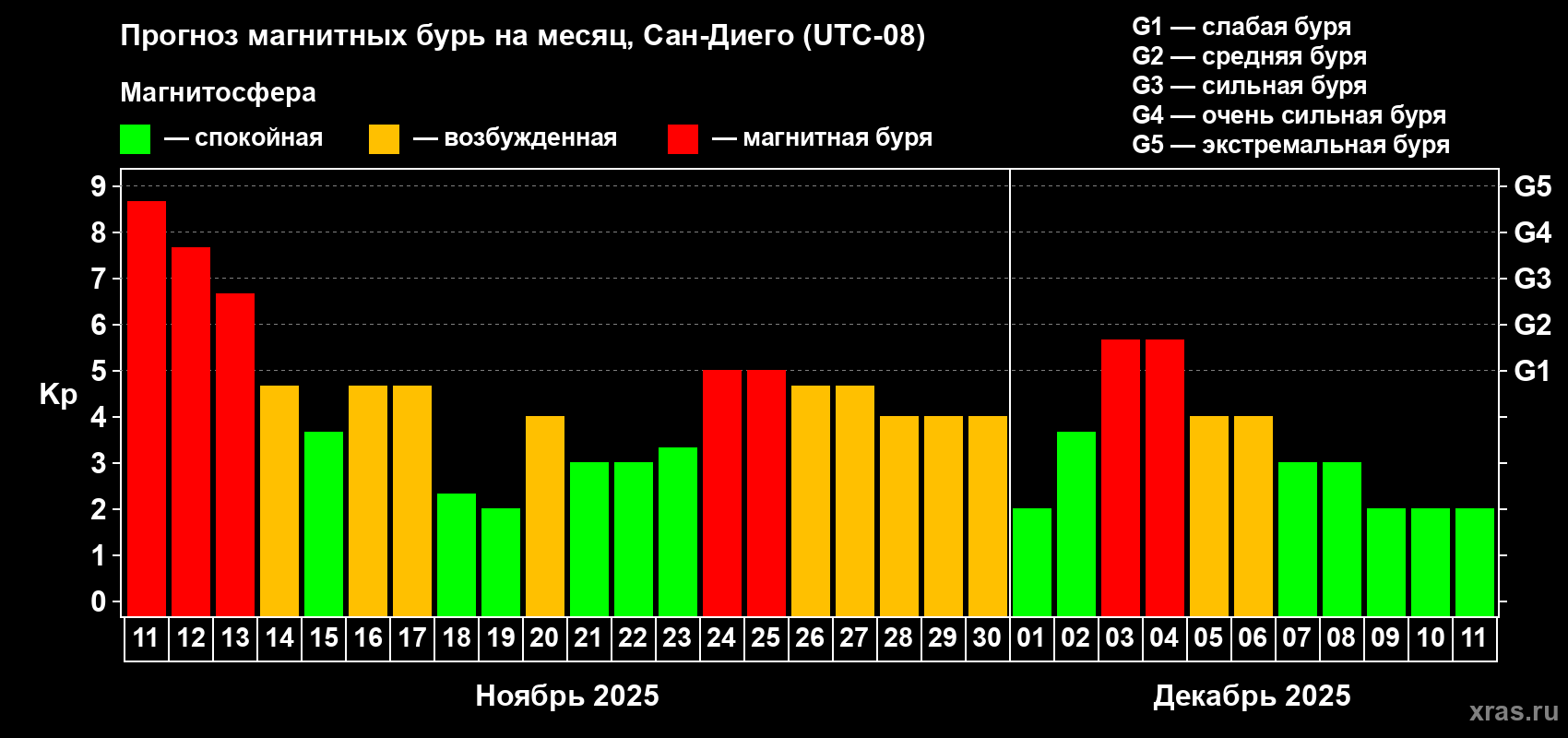 Прогноз магнитных бурь Сан-Диего — 11 ноября 2025 года