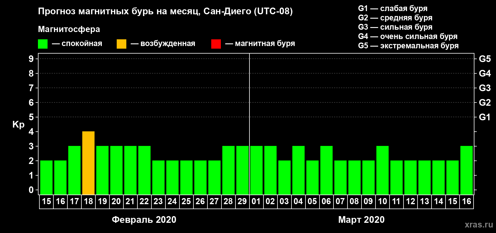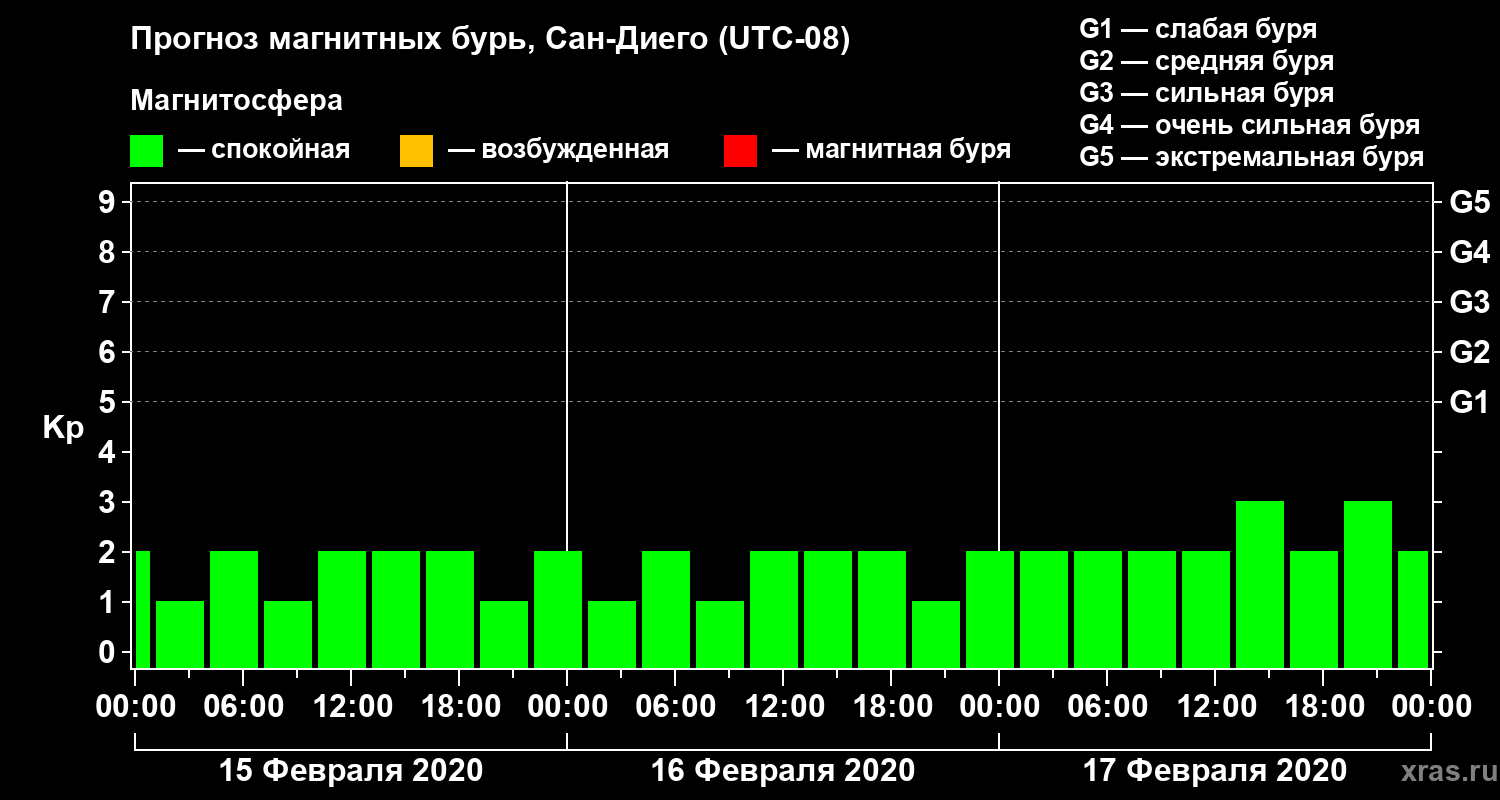 Прогноз магнитных бурь Сан-Диего на 15 февраля 2020 года