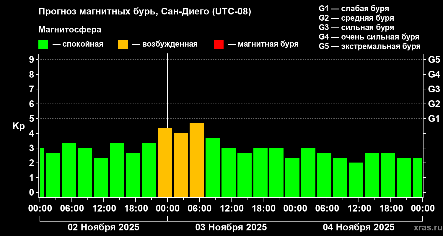 Прогноз магнитных бурь Сан-Диего на 2 ноября 2025 года