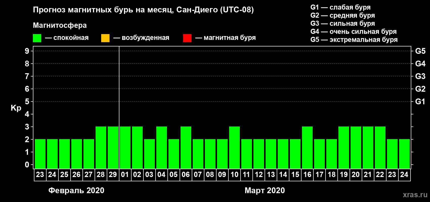 Прогноз магнитных бурь Сан-Диего на 23 февраля 2020 года