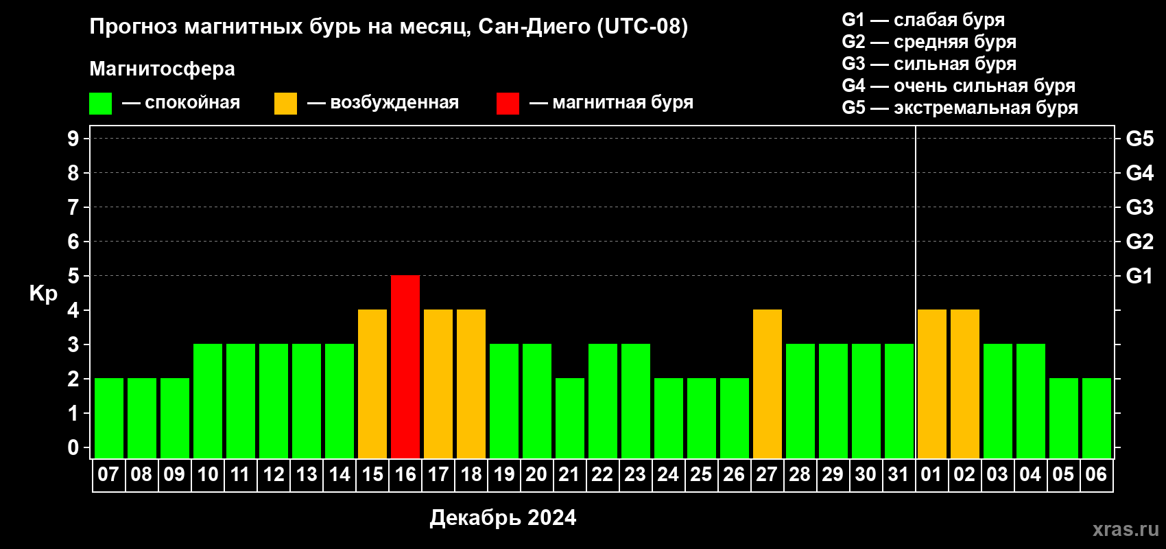 Прогноз магнитных бурь Сан-Диего — 7 декабря 2023 года