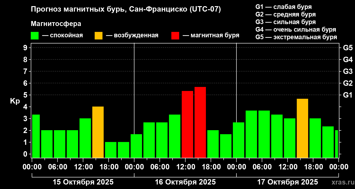 Прогноз магнитных бурь Сан-Франциско на 15 октября 2025 года
